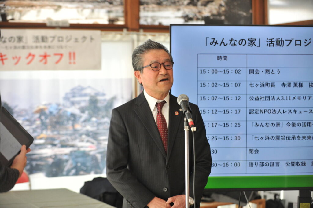 寺澤町長は、「みんなの家」ができるまでの思い出や、RSYとの関わりなど様々な想いをお話された。そして七ヶ浜の震災の歴史を未来に向けて若者が前に向かって進んでいくことを応援していくことをお話されました。