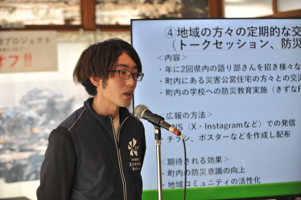 担当スタッフである若生遥斗からは、町民の証言を記録・発信していくこと、「みんなの家」は広域支援活動のモデルになりうることを発信していくことや活動で学んだことを南海トラフ想定地域に発信するなど今後の活動について話した。