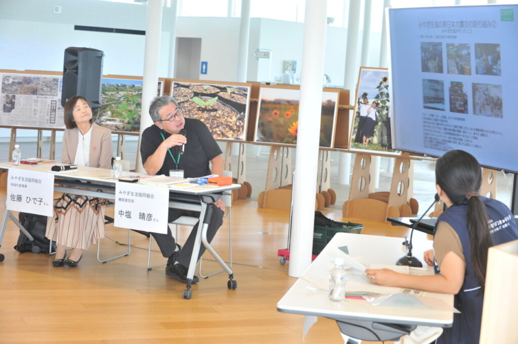震災後、みやぎ生協の店舗の内14店舗が被災、2店舗は閉店を余儀なくされたそうです。しかし、3月11日から再開した店舗も多かったそうで、集会場も使用で来たそうです。学校などの指定避難所では集まることが難しく、そのため生協の集会所がとても役に立ったと、佐藤さんはお話されていました。