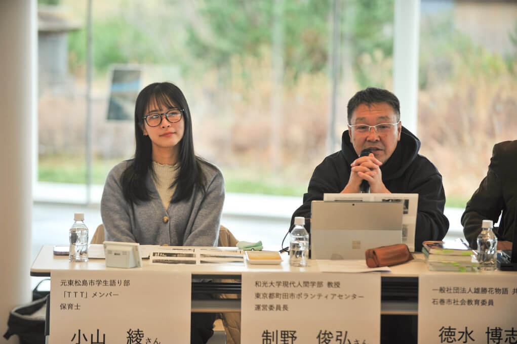 中学時代に制野さんの教え子だった小山さんは、津波で大きく変わったまちの中で育った自身の経験を語りました。家族が無事だったことへの後ろめたさを抱える中、みかぐらは心を「無」にし、自分を保つ支えだったと振り返ります。